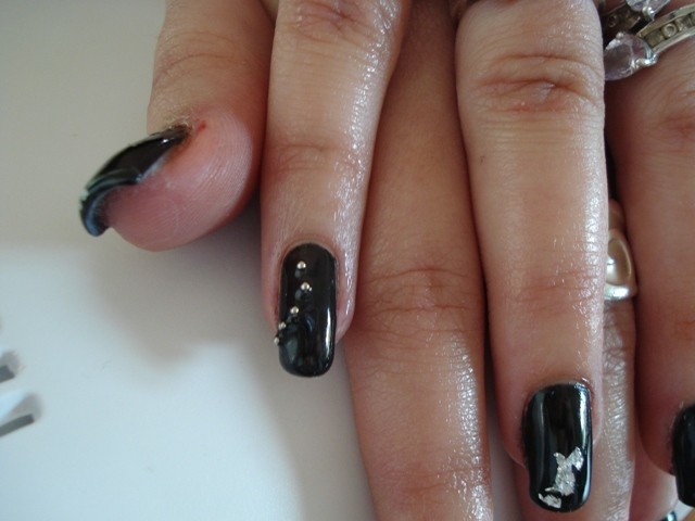 1ere pose en gel de couleur noir de chez ongle 24 il esttrop top mais a travailler doigt par doigt , feuille d'argent, mini perle doré et piercing de chez turquoise: cette pose a 15jours desolé j'oublie toujours mon appareil (on ne se moque pa linie) :happydance: