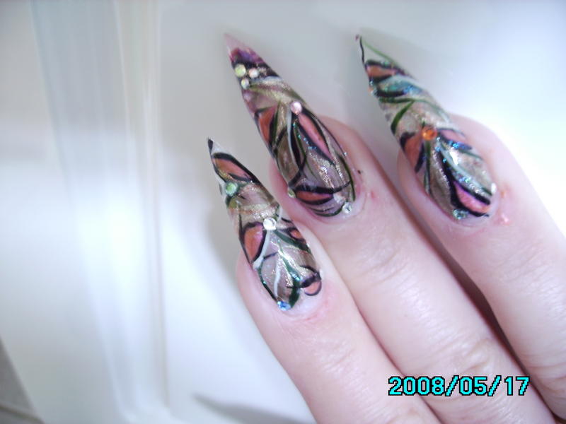 Motifs en gels de couleur + vernis et differents strass, paillettes bleues par ci par là mais on voit pas sur les photos
