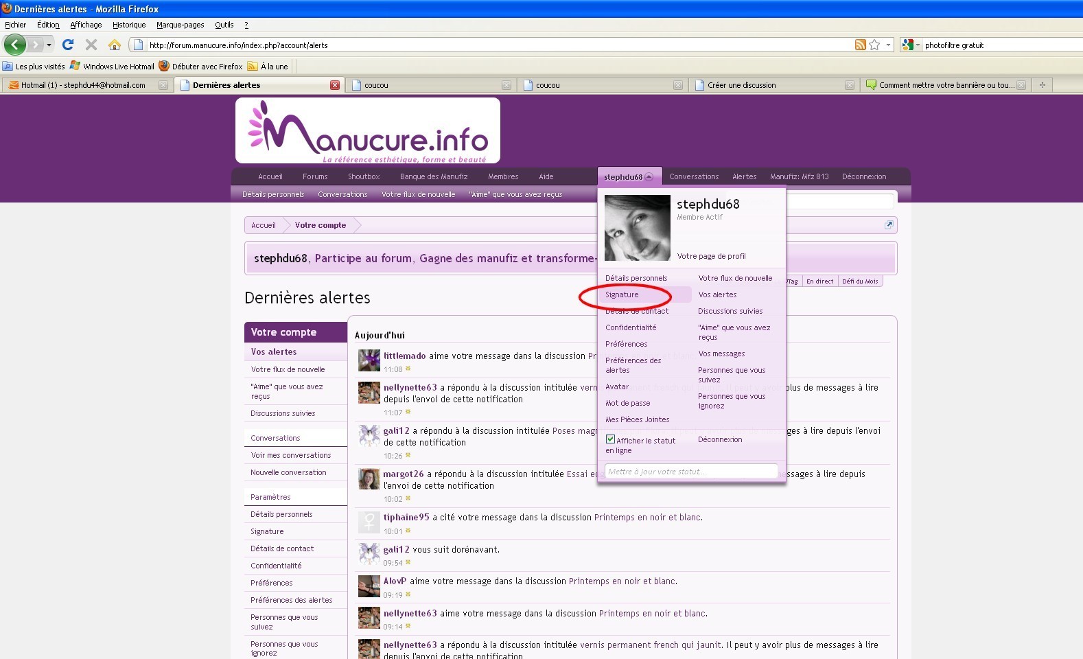 Dans votre profil sélectionner signature (photo10)