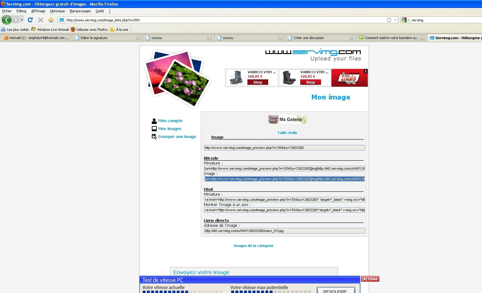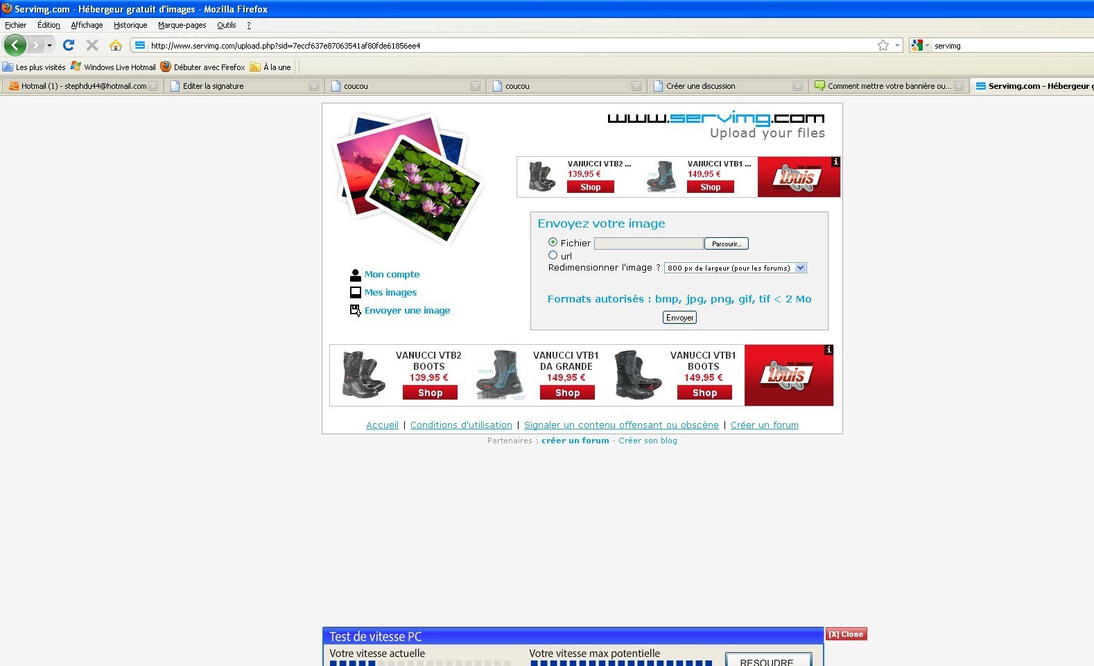 Pour charger votre photo pour la signature (comme on peut pas la charger directement sur cette partie du forum), j'utilise servimg http://www.servimg.com/?lang=fr (vous pouvez créer un compte c'est gratuit). (photo 11) Cliquer parcourir puis sélectionner votre fichier. Dans redimensionner l'image (juste en dessous), sélectionner "non" puis cliquer envoyer.