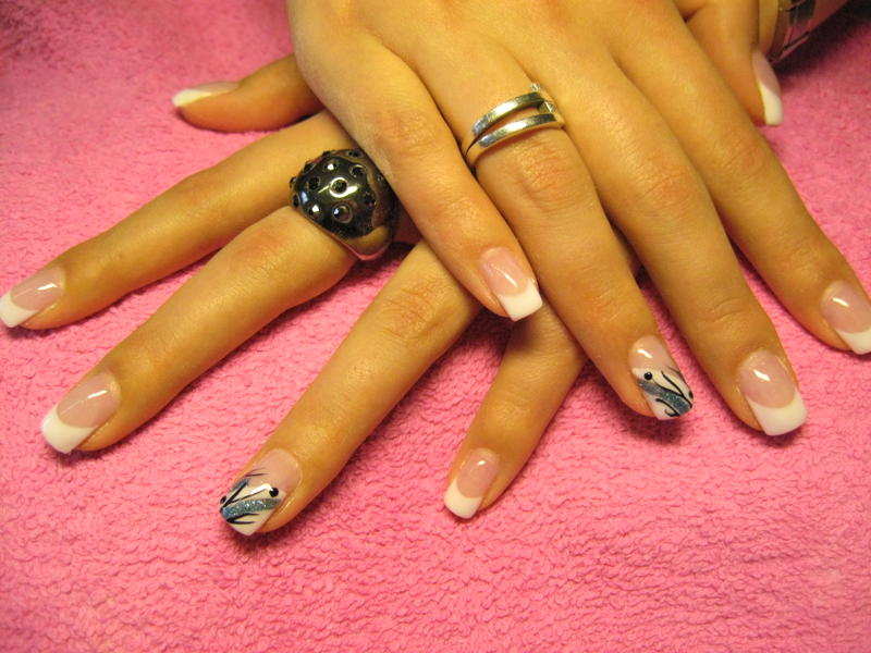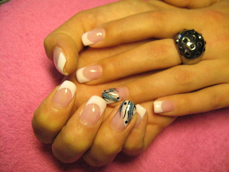 Gel blanc, paillette vert bleu, trait au stripping et strass noir)