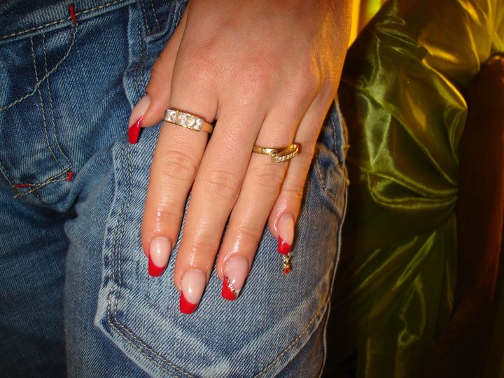 je me suis fait une banale french rouge, avec petite deco sur l'annulaire, et un petit piercing assorti ( ils viennent de chez turquoise cliquez ici pour acheter les memes !)