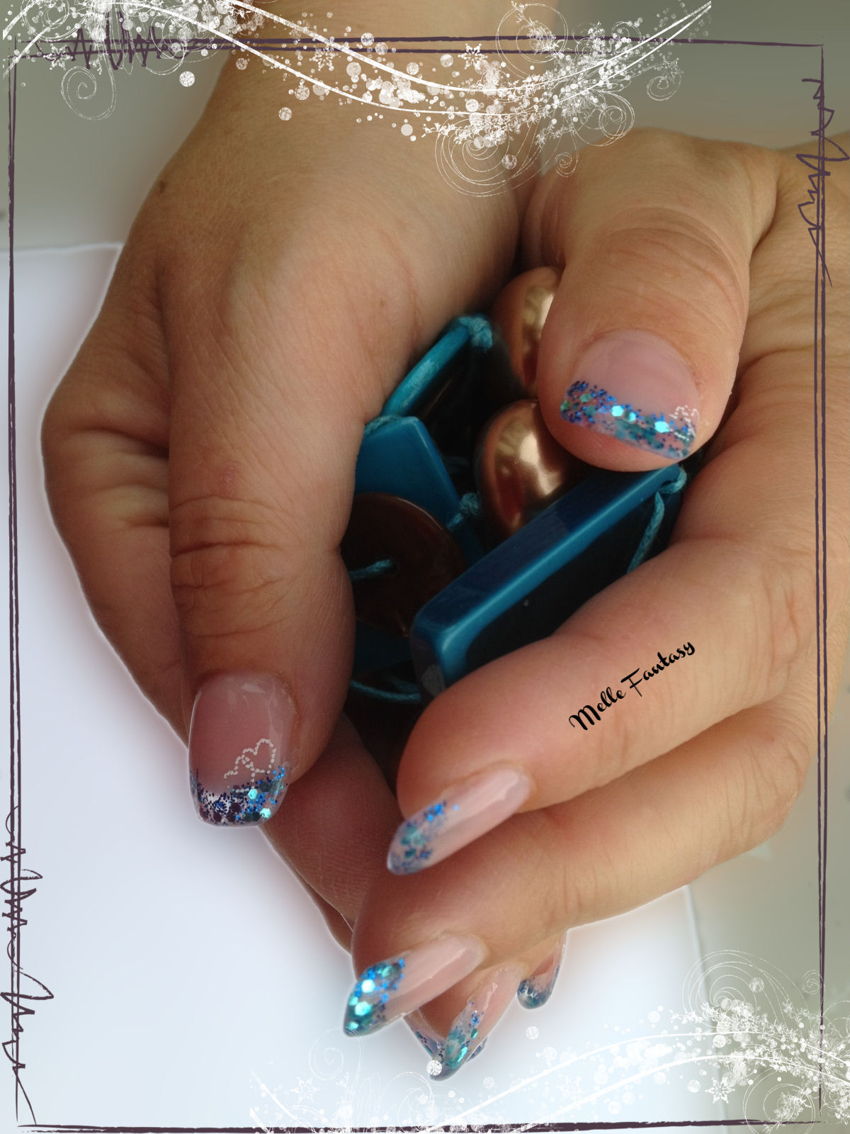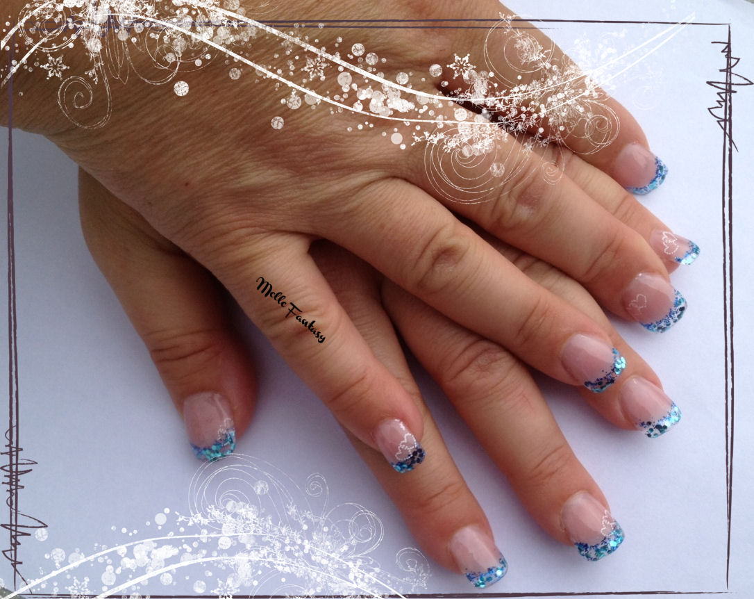 voila encore une nouvelle pose en essai j'ai galere car la copine est une ancienne rongeuse ongles qui part de travers la peau qui est tres remonte sur les cotés dinc hummm j'ia fais comme je pouvais d'habitude je ne travaille pas de cette facon la j'ai fais le modelage avec la longuer ensuite le mask et la french pailettés et c'est plus epais grrrr