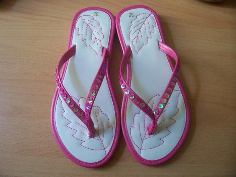 -1 paire de petites tongs roses, neuves, pointure 35 (je les avais achetées pour ma fille mais elles lui sont trop justes): 5 euros.