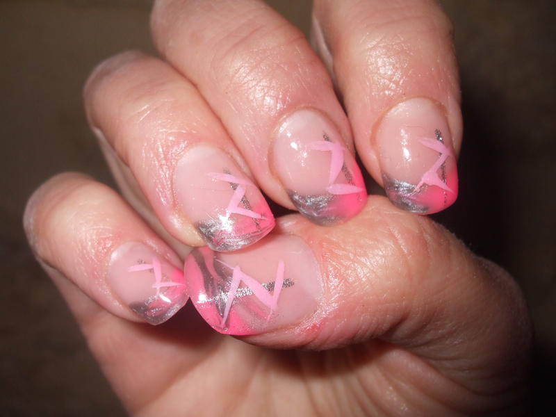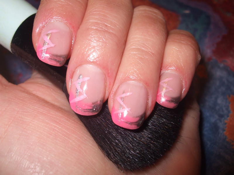 Gel monophase, gel couleur rose néon et gel couleur gris. Petit effet marbré sur la french.