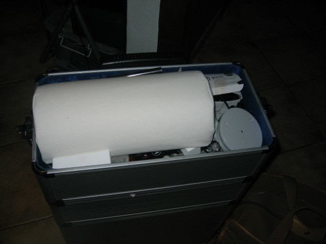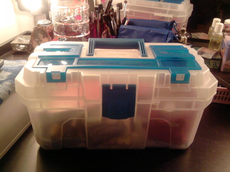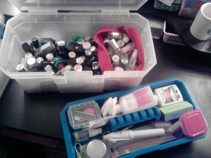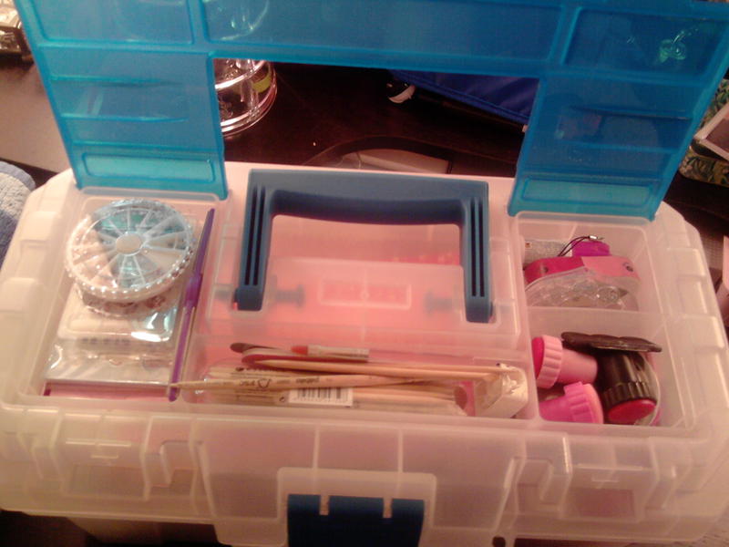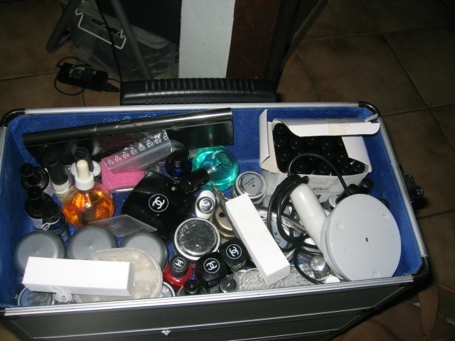 -dans le sac, mon aspi et mes decos. dans la boite en fer, mes acrylique et gels couleurs (pots transparent, je dois les abriter de la lumiere). un ptit carnet photos ou je range mes stickers qui ne me servent plus à rien depuis mes flexs,lol. un genre de panier bleu en tissus resille ou je range le reste: strass, paillettes, etc. au fond du sac plein de bordel,lol.