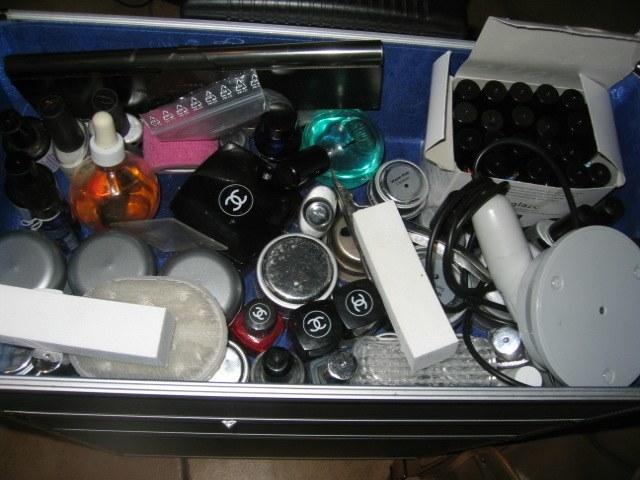 -en bas: ma lampe, ma rallonge, mes liquides, mes cottons,un pot avec limes et pinceaux . sous le pot une boite avec mes gels couleurs. le reste de ma ponceuse.