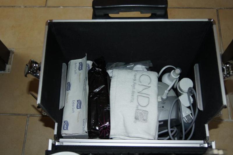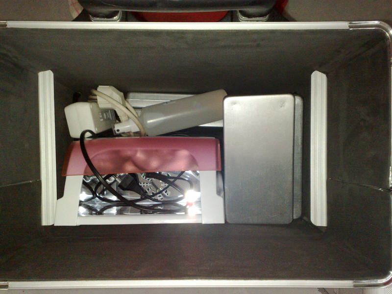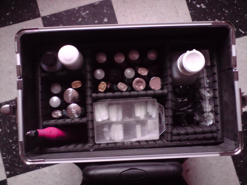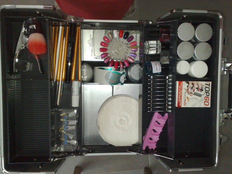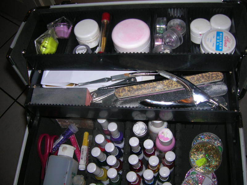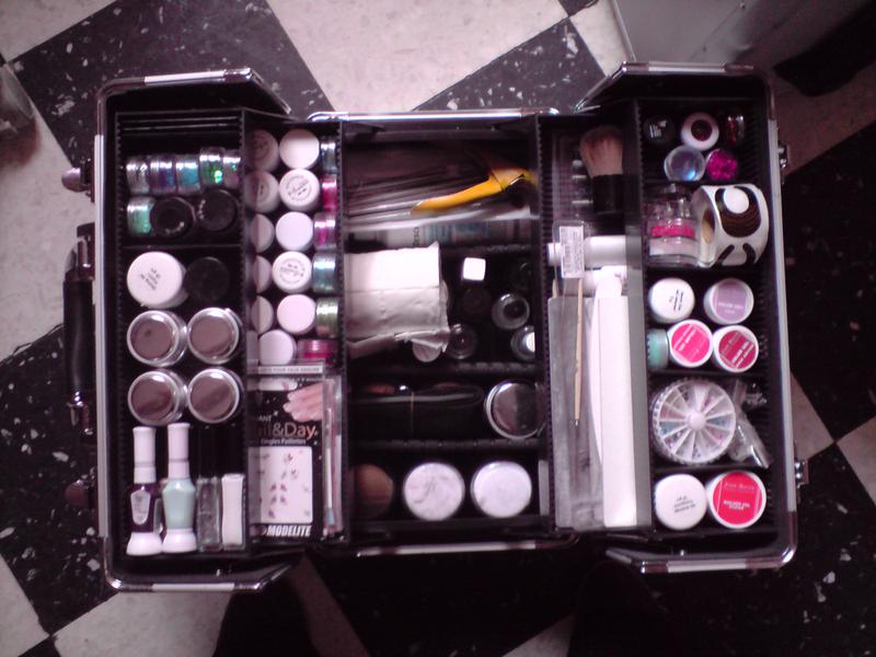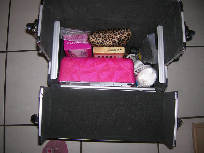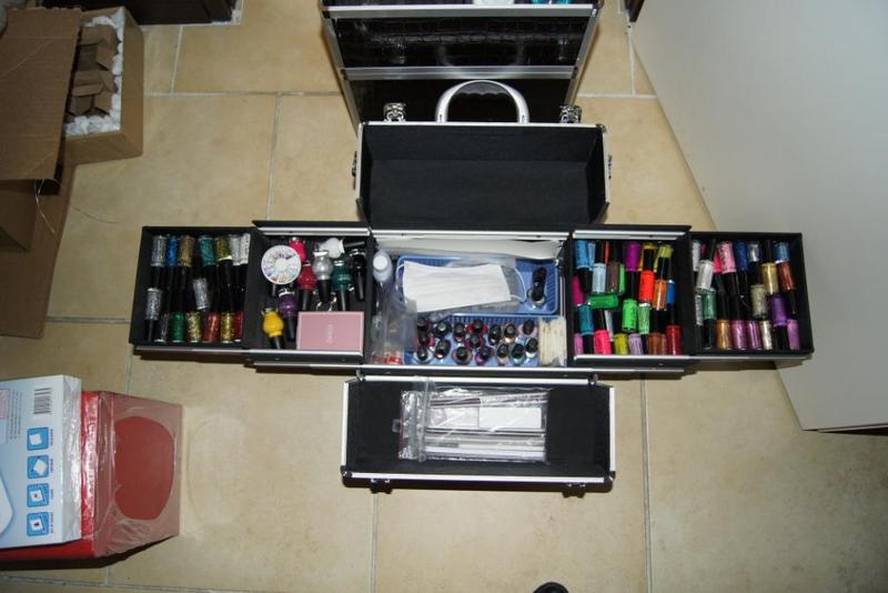 Je vous montre donc les photos, sur la première les vernis, sur la deuxième le coffre du dessous avec la lampe, rallonge et boites en alu qui contiennent mes décos triées par couleur et la dernière la malette du dessus avec gels, pinceaux, chablons, toujours mes boites en alu et un peu de place pour mes liners et gels de couleurs qui vont bientot arriver !