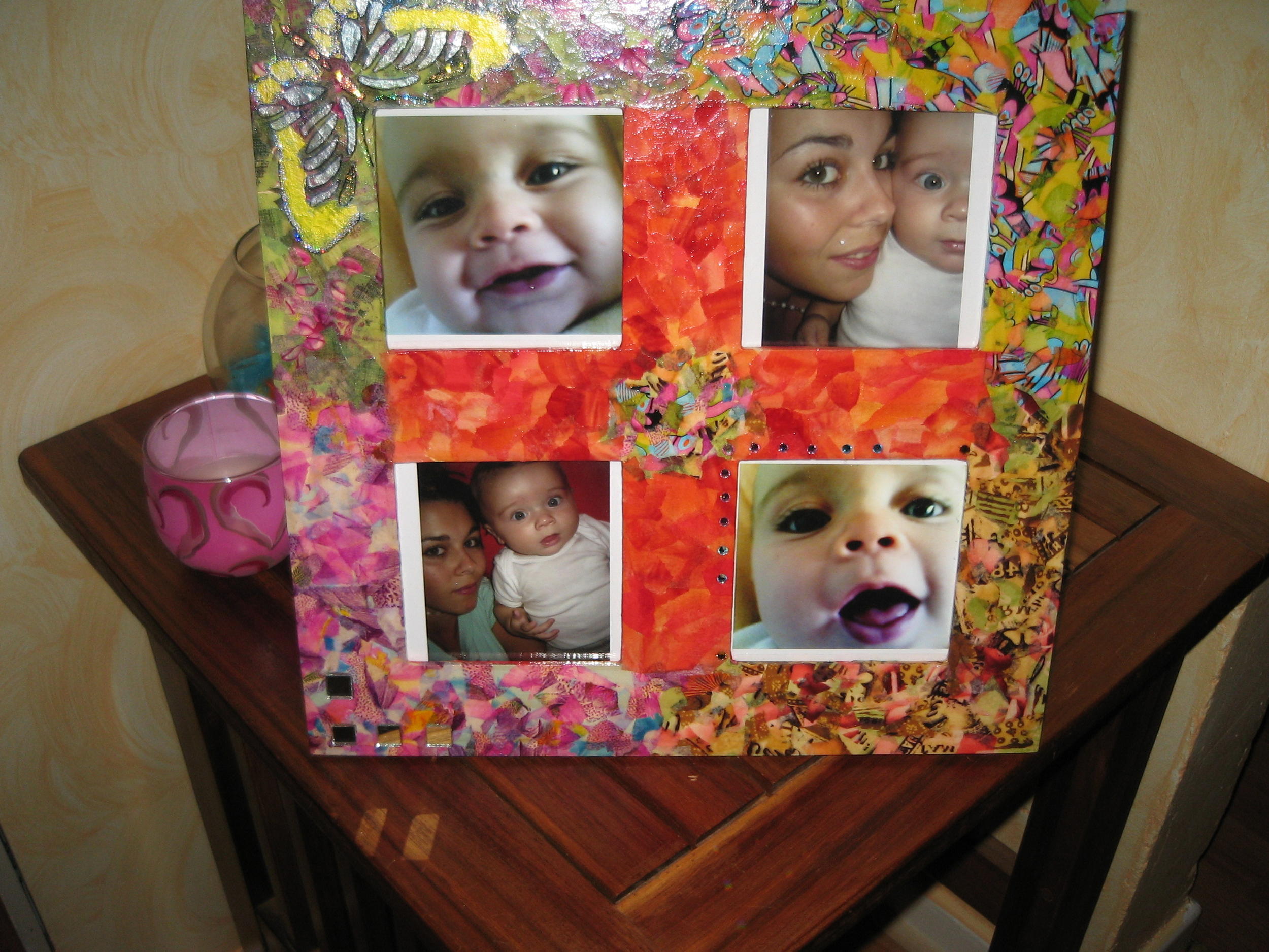 1er:cadre en mosaique avec galet noir et noir moucheté blanc,2eme: cadre recouvert à l'aide de papier décopatch avec des strass swarovski et pochoir fait à l'acrylique,3eme et pour finir les stickers de mon salon!!! lol