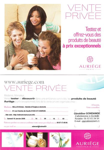 Lillou (Esthéticienne) et moi (Styliste d'Ongles) organisons une nouvelle édition de vente privée de produits cosmétiques à mon domicile Samedi 19 janvier 2008 de 14h à 16h! Je précise qu'il n'y a aucune obligation d'achat.