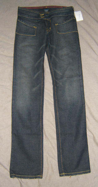 C'est une taille 27, 100 % coton (l'étiquette est encore accrochée au jean), il a 2 poches devant, 2 derrière, je n'ai malheureusement pas de photo, mais dès que je récupère mon appareil, ce WE, je fais des photos afin de les envoyer à celles qui seraient intéressées ! Je ne crois pas que ce modèle existe en France...