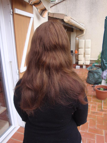 - comprenant bien que mes cheveux foncent et donc que mes colo chient, j'achete un l'oréal 8.1 (meme si la vendeuse ne voulait pas) puisque le vert neutralise le rouge, je ressort avec un 7 en visuel (on arrive quelque peu a l'objectif premier). J'aime bien le résultat, mais la colo est encore fraiche (je l'ai faite hier)