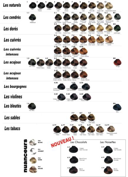 - de blonde platine a méches dorées je passe a un 6.46 Wella (soit chatain clair acajou), ca me donne un noir reflet rouge sur moi !