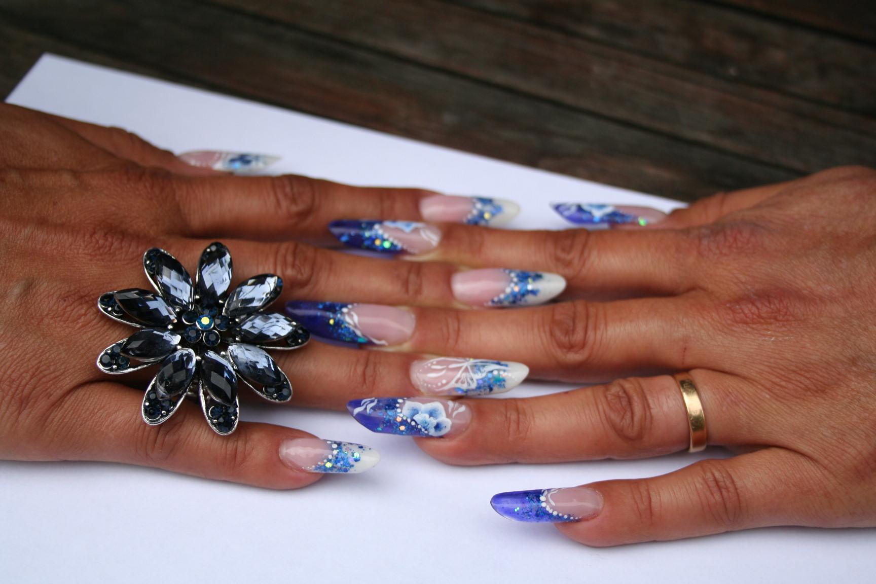 Main droite,french a construire blanche,plus les memes paillettes que la main gauche (indigo) et papillon en simplicite.