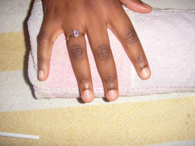 Deuxième question: j'avais un problème lors du limage car ma copine est très fragile dans le coin de l'ongle, sa peau à tendance a s'arracher un peu ce qui fait qu'à chaque fois que je limais pour la démarcation dans le coin , je soulevais la peau et elle saignait légèrement mais comme c'est une chochotte (une sensible autrement dit) ben je devais abandonner ce qui fait que ds le coin de l'ongle on voit un peu la capsule mais rien de méchant.