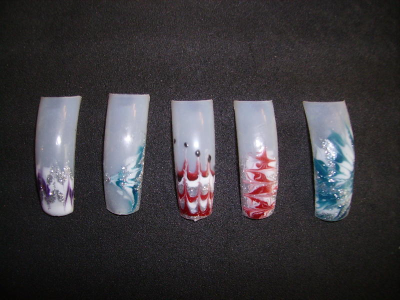sur la premiere photo de ta marbrure je pense que tu a tiré tes couleur avec les pointe metalique d'un marbell... pour avoir un resultat plus net moi je le fait au pinceau mais tu peux le faire au cure dent car la pointe est fine... voila je te met une photo pour que tu vois ce que ca donne.....