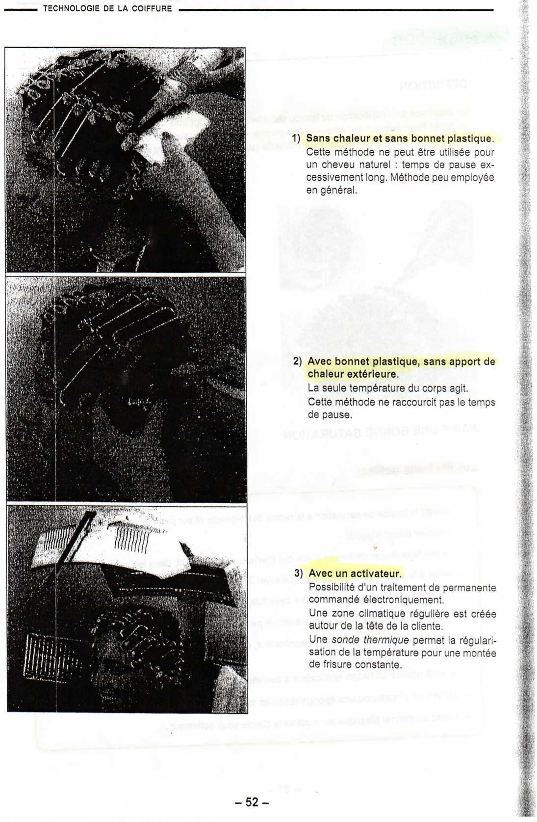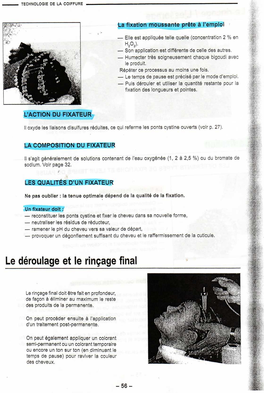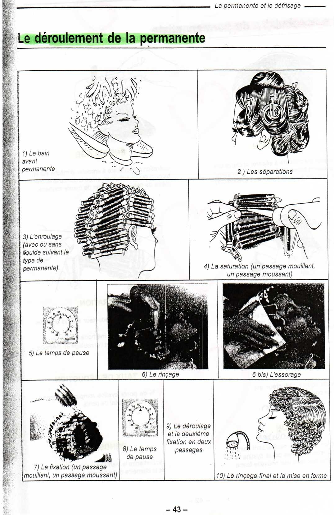 La permanent : c'est un renroulage de bigoudis avec l'application d'un produit réducteur afin de modifier la forme du cheveux pour que les boucle obtenues soit "permanente"