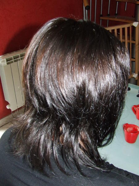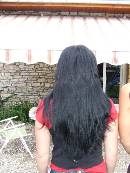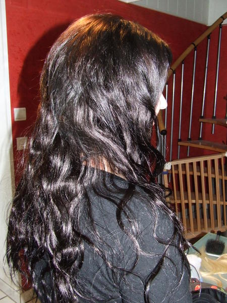 ,la dernière cliente aux cheveux noir g omis de faire une photo du avant :/ , elle doit aller chez un de nos coiffeur partenaire dans la semaine car elle à les pointes très abimés ca se voit sur la photo et pour marier bien sa base aux extensoins et elle veut recouper les extensions car elle les trouves trop longues lorsqu'elles sont lissée (il s'agit d'un kit ondulé à la base)et elle doit aussi refaire une coloration (ca aurait ete plus simple avant mais bon ) car elle à voulu se faire des mèches violette et du coup elle a un reflet violine aux racines et a certain endroits de sa chevelure, mais à l'oeil nu comme ca on voit pas , en photo ca ressort je touve