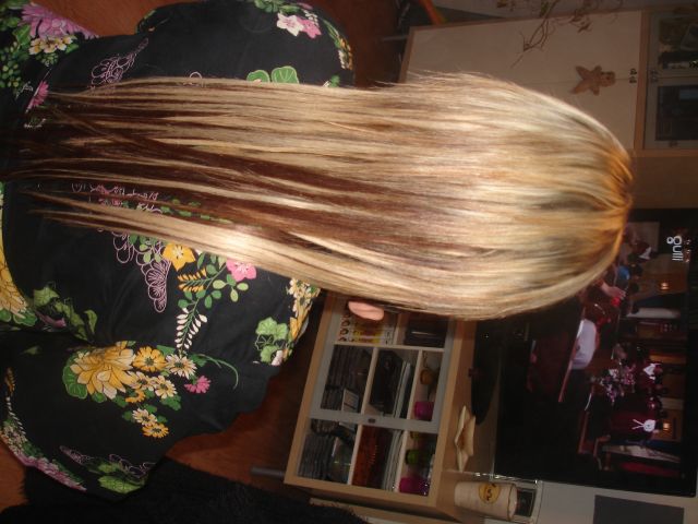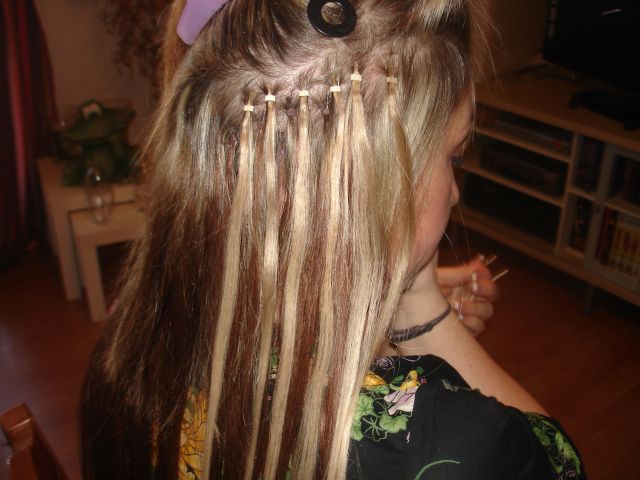 voici ma premeire pose , d'extensions a froid . Sur cecilia mon fidele modele. Bon je lui ai mi que 70 meches car elles a pas assez de cheveux sur le cailloux., j'avais peur qu'on voit les petits anneaux . Mais bon la prochaine fois j'en rajouterai un peu plus .