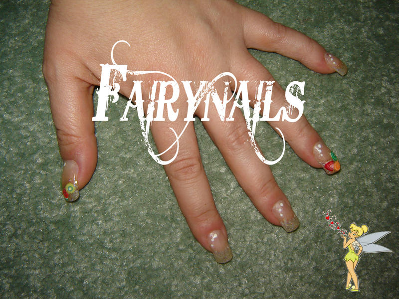 non, j'ai opté (quelle idée!) pour une pose chablon, résine transparente, dont le bout est teinté de pailletes (mix fait maison, bien oui, j'ai preféfé juste investir dans le minimum de matériel au cas où je serais vraiment nul :atmos:) et agrémenté de quelques fruits en fimo, sur le pouce et l'annulaire... ah oui! et de quelques points blancs au dotting aussi.