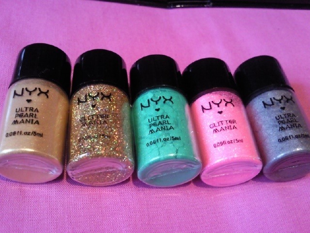 J'ai pris, Yellow Gold Pearl, Hot Gold (magnifique! les paillettes sont multicolors), Jade pearl, Hot pink, Silver Pearl.