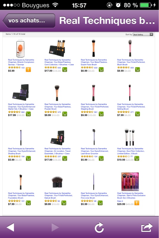merci pour le lien mais il y a que quatre pinceau :/ j'en voudrais minimum 10 ou 12yadefa a dit:C'est les reals techniques à partir d'un montant les frais de port sont offerts et c'est en dollars en plus donc tu fais la conversion ça te reviens moins cher... http://www.iherb.com/Real-Techniques-by-Samantha-Chapman