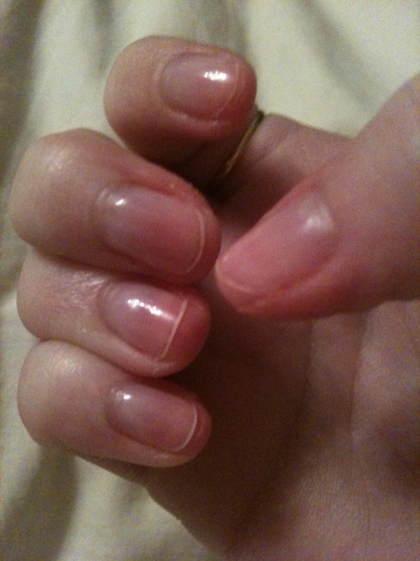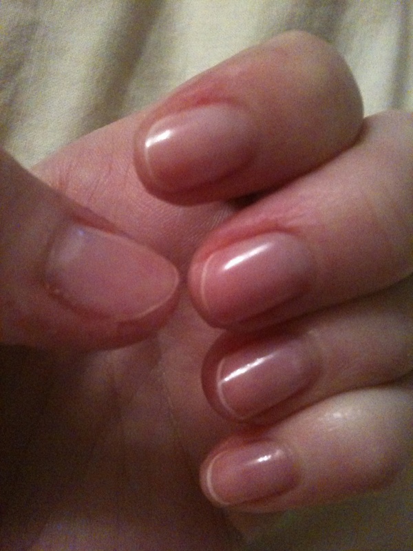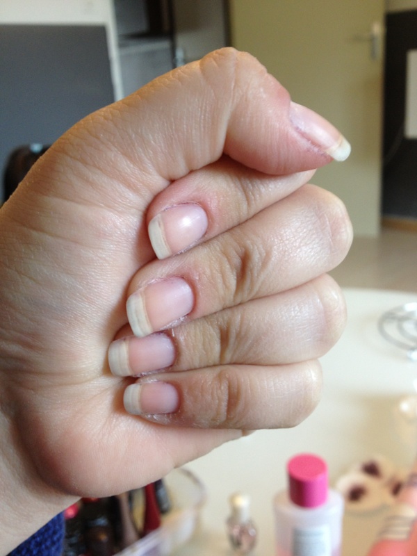 Je suis super dégoûter j'ai du tout couper car j'ai voulu tester un vernis permanent de la marque Alessandro (striplac) et bien mes ongles sont devenu tout tout tout mou et donc sa me faisait plus mal et il se retourner et ce plier en a rien.