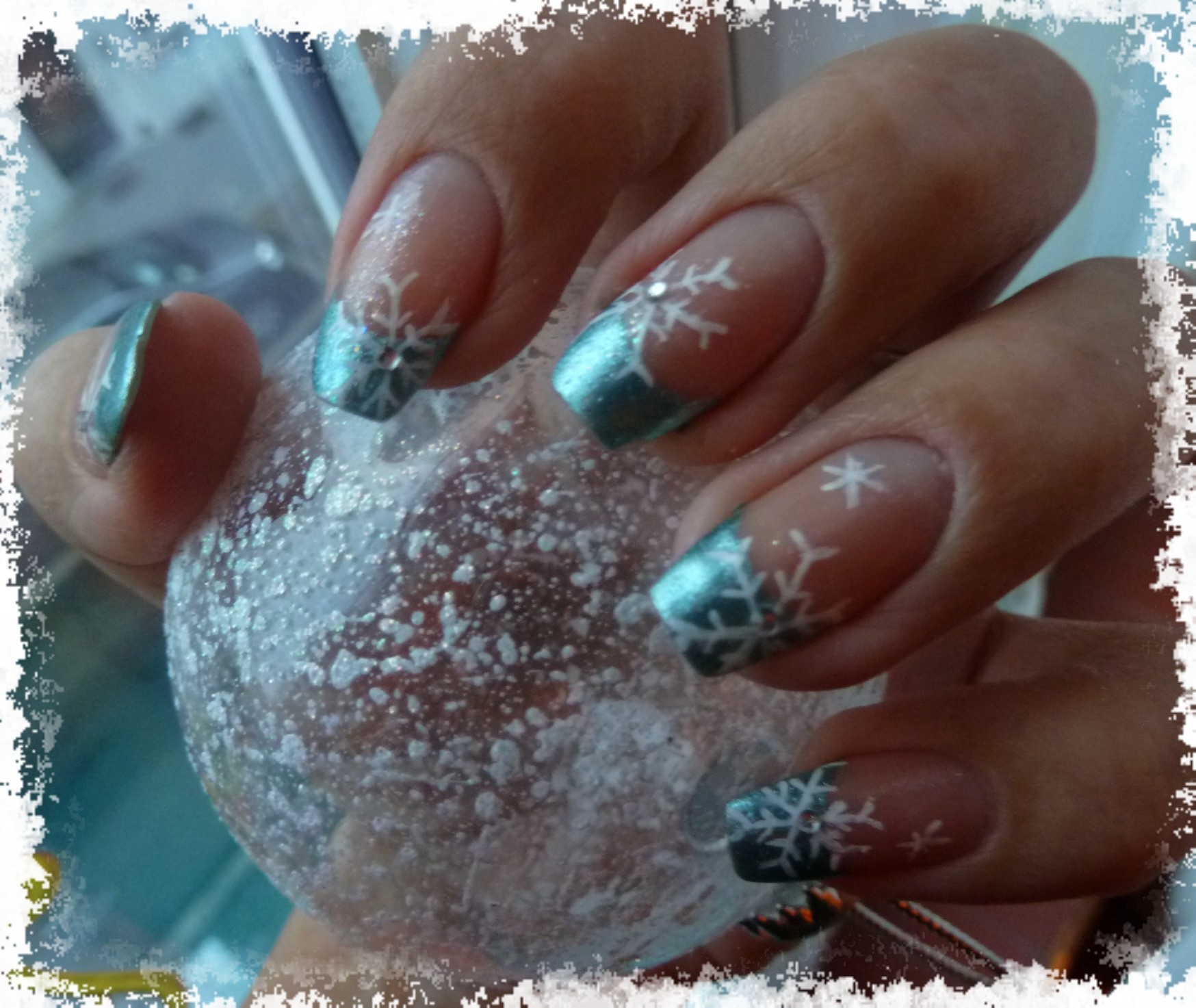Hello les filles j'ai fait mon sapin today du coup j'ai repris la photo de mes ongles ça n'à pas bougé je suis étonnée de voir comme les strass tiennent bien juste avec le top coat ! j'en ai juste un qui à sauté main droite mais je me souviens que celui là j'avais fait qu'une petite boule de top coat pas +