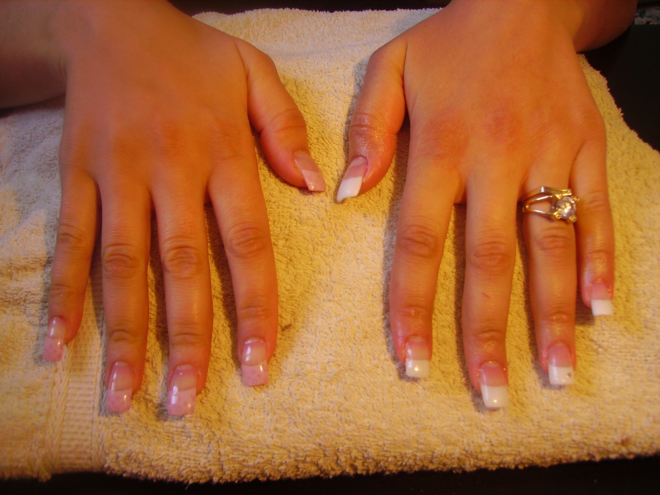 l'ensemble est pas mal du tout , pourquoi ya t'il un ongle qui pique du nez??? le pouce de la main avec french blanche est superbe :wink::wink: ha dis moi c'est une crotte de nez qui traine sur la serviette:harhar::harhar::harhar:ha encore un truc le petit doigt de la french rose est pas bien équilibré trop de french !!!