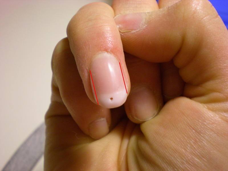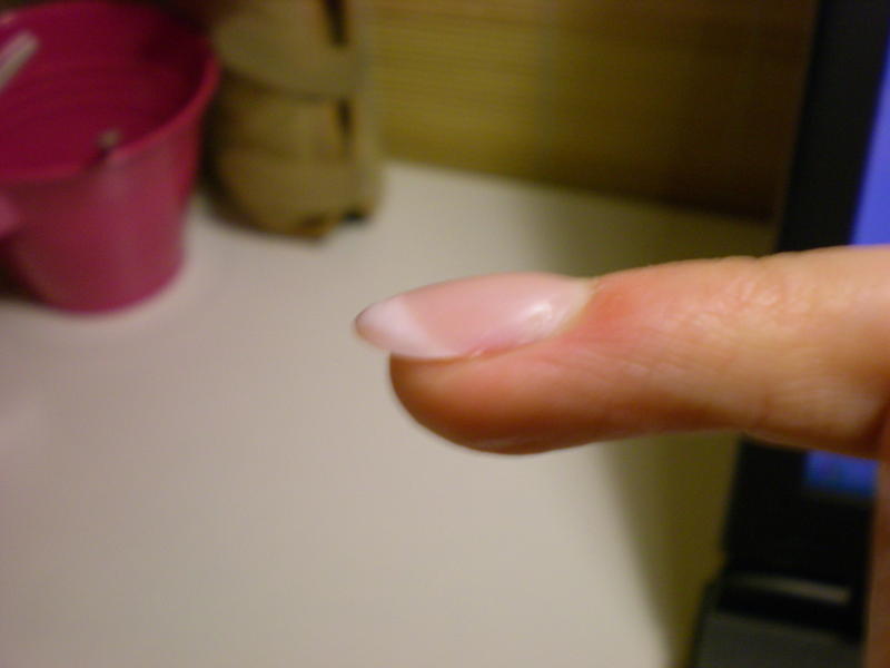Alors c'est mieux, mais ce n'est pas encore ça. Quand tu limes ton ongle sur les côtés (les parallèles), il faut que ton ongle soit dans le prolongement de l'ongle naturel. Tu dois donc limer dans la gorge de l'ongle (la petite "rigole" de chaque côté).