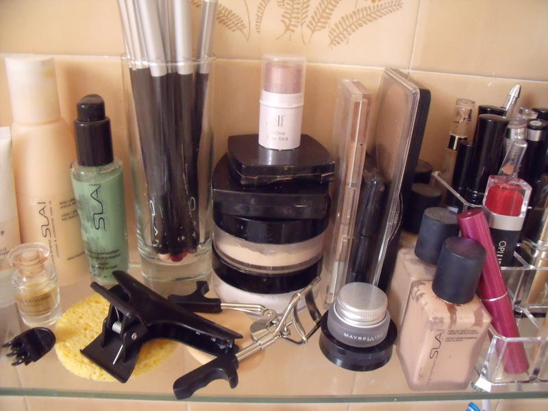 je vous dis celui que j'ai fait hier : correcteur de teint, fdt + poudre, fap de ma "palette" (genre elf fait des palettes lol) drama de elf pour faire un piti smokey sur la paupière mobile et du violet dans le plis.