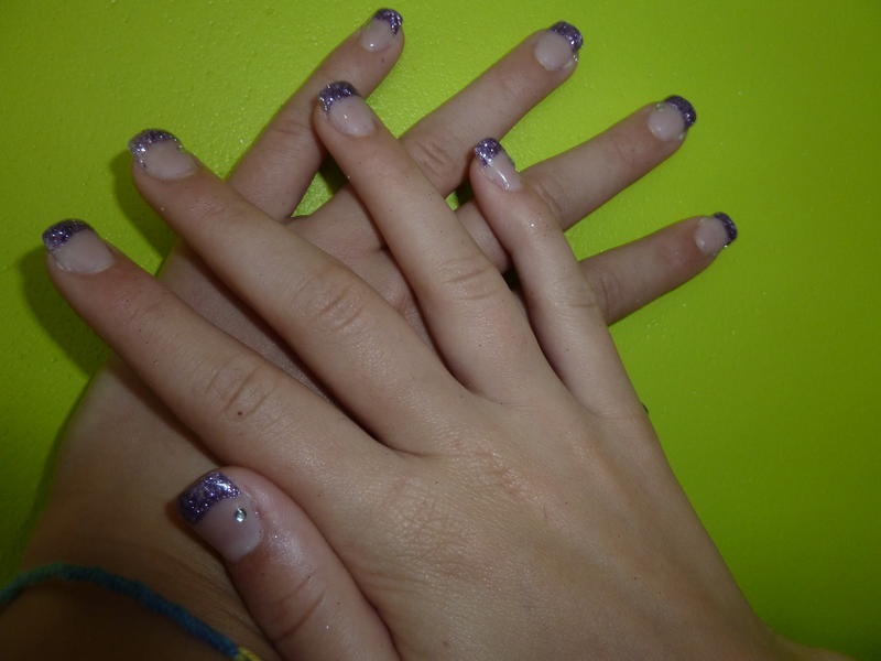 Elle voulait une french ultra pailletée et non quelques paillettes éparses... donc, je n'ai pas utilisé un gel pailleté mais j'ai plongé les doigts dans un petit pot de paillettes qui se sont collées sur ma french dessinée en gel transparent... un travail de fou... mais bon, elle était contente du résultat...
