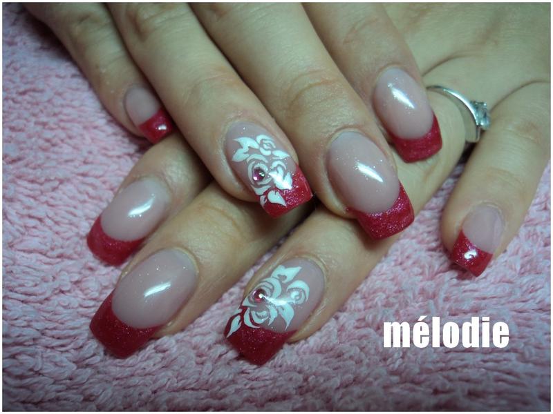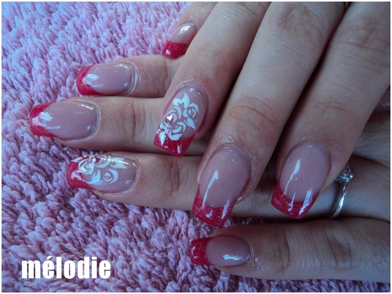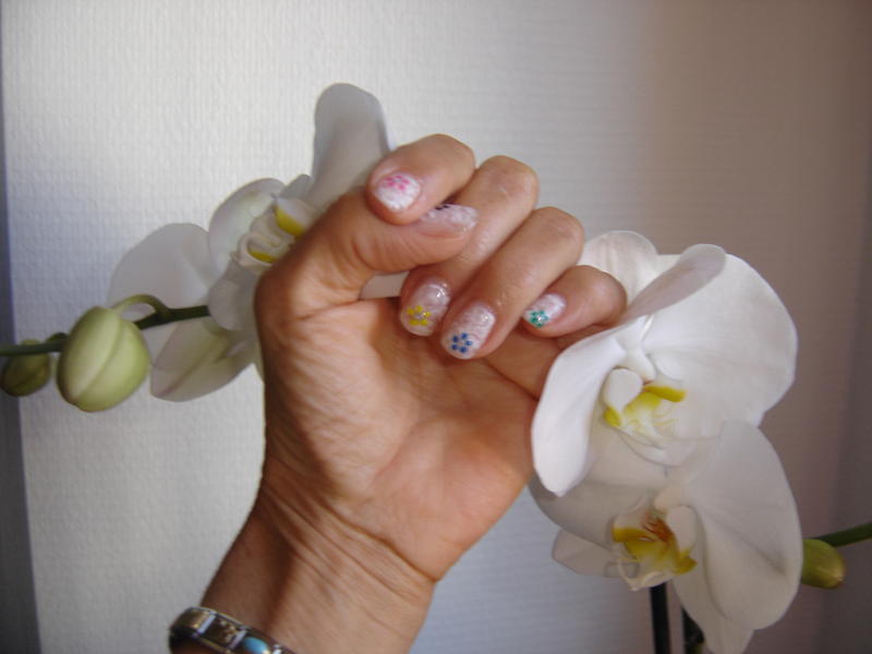 Pose en gel monophase.Décoration que j’intitule effet dentelle travaillée au gel blanc et au spot.Et petites fleurs colorées faites au liner.