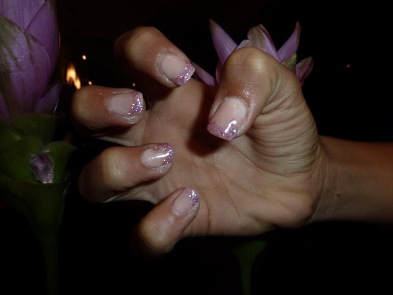 3/ J'ai utilisé un pot de paillettes. Base, camouflage (car tips), une couche fine de construction, catalyser, dégraisser, french en gel transparent, tremper le doigt dans le petit pot de paillettes, retirer sans trop frotter le surplus de paillettes avec un large pinceau, catalyser, brosser l'ongle pour enlever le trop de paillettes puis continuer la pose... construction, finition...