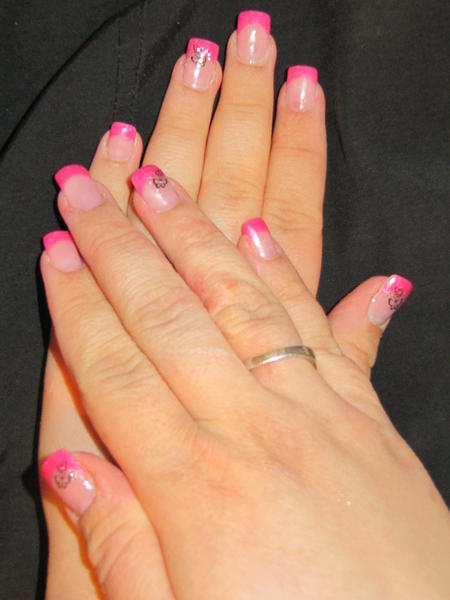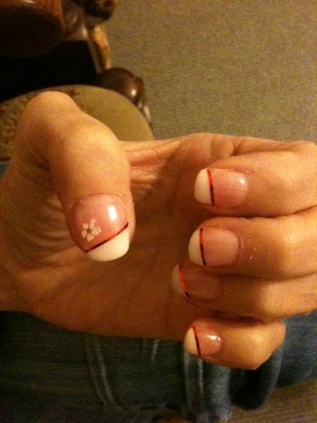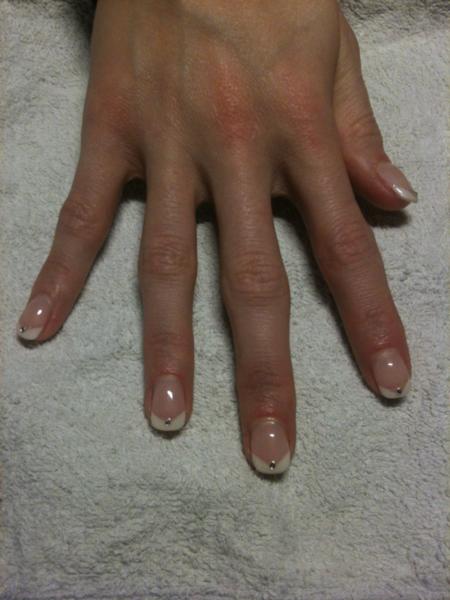 Pas parfait certes mais joli! pense à mettre plus de matière à la zone de stress et bien limer parallèle, voire un peu plus "en dedans" AVANT la pose de gel pour ne plus avoir à limer "après"