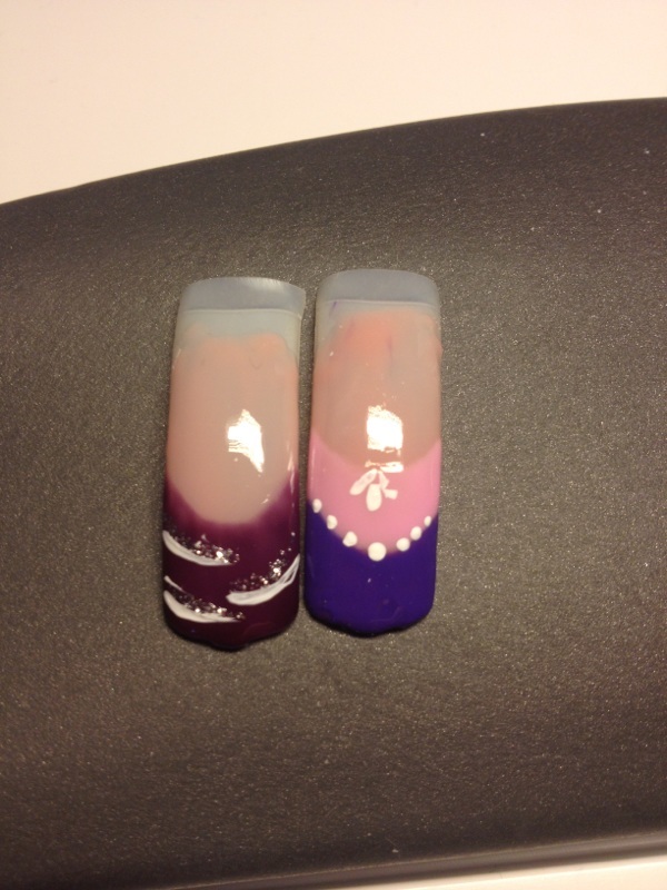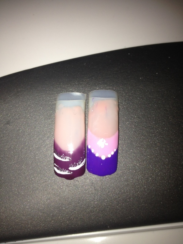 Un gainage, déco noire. Un rallongement, déco violette et un rallongement sur ongles bien bien rongés, déco bleue.