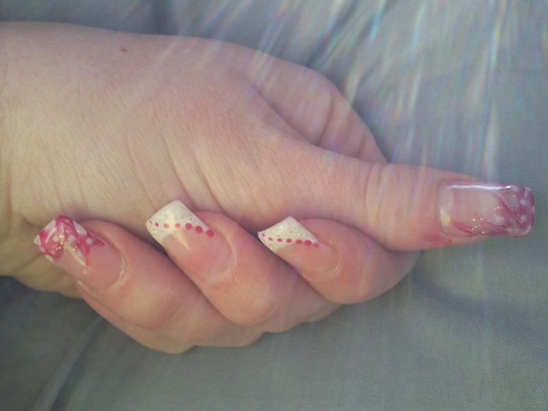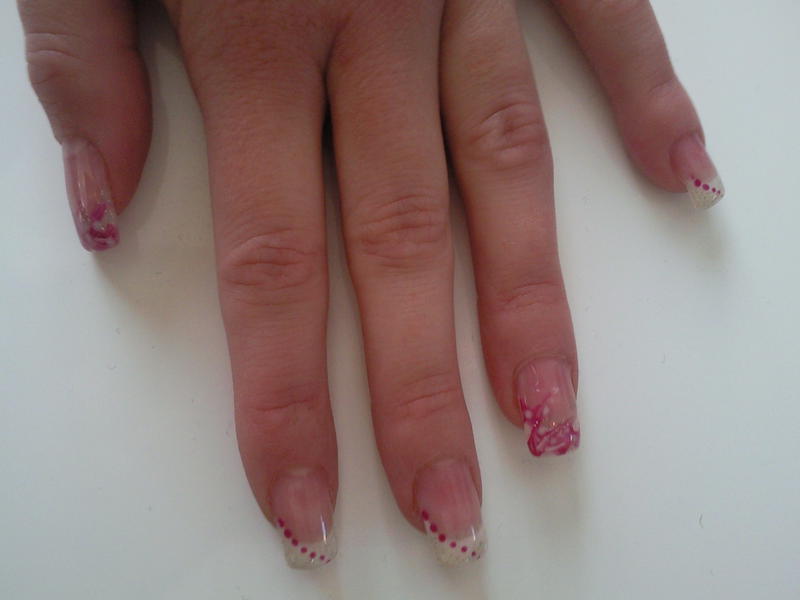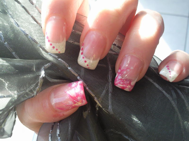 Alors en fait je fait des traits de biez blancs et fuschia et ensuite à l'aide de la petite pointe de mon spot je fait des traits (pour étirer les gels) en partant du coin de l'ongle vers le haut! je crois que ca s'appelle un marbré! jespère que vous avez compris pas facile d'expliquer!Et merci pour vos réponses les filles!D'autres avis???