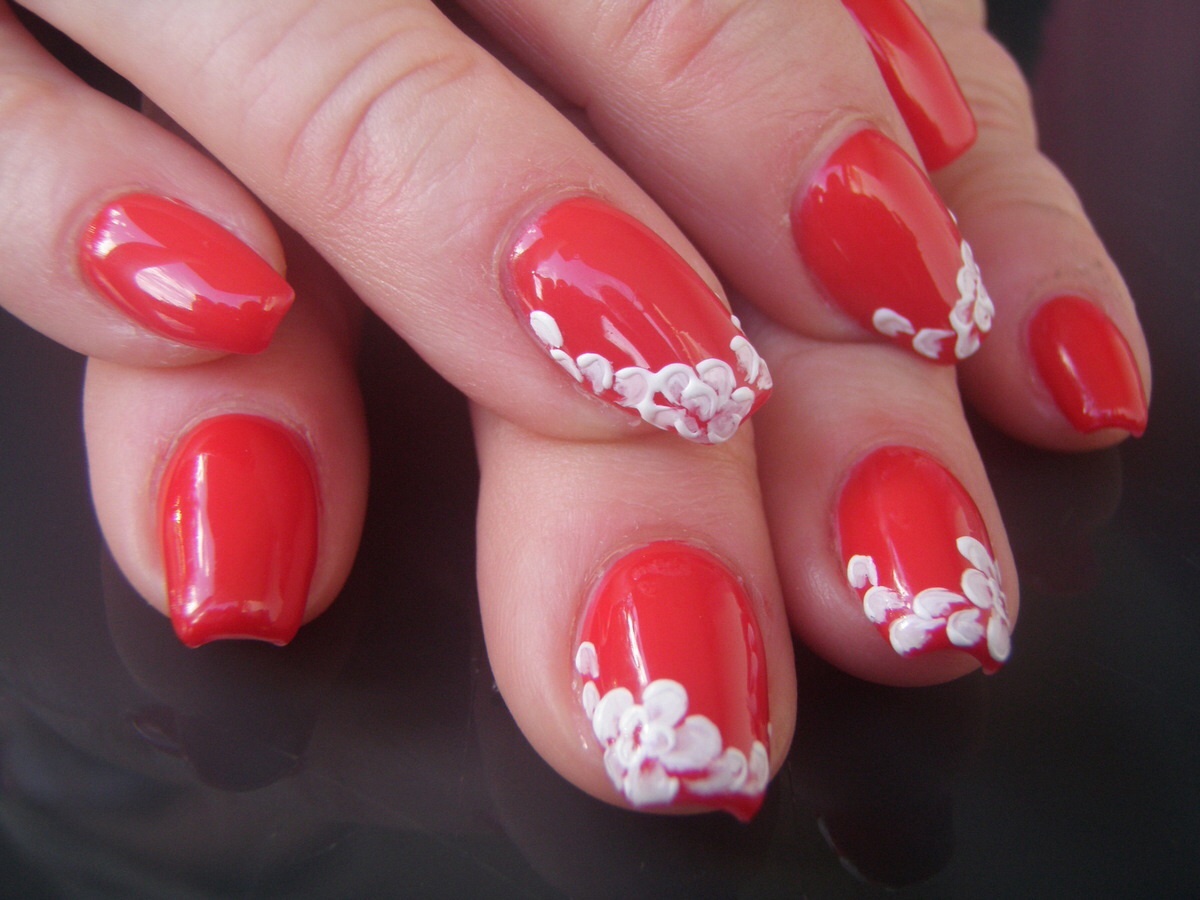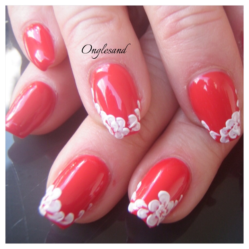 Un petit vernis rouge et des fleurs en one stroke blanches monochromes sur lesquelles j'ai fais quelques contours au gel uv one stoke blanc afin de créer un peu de relief.