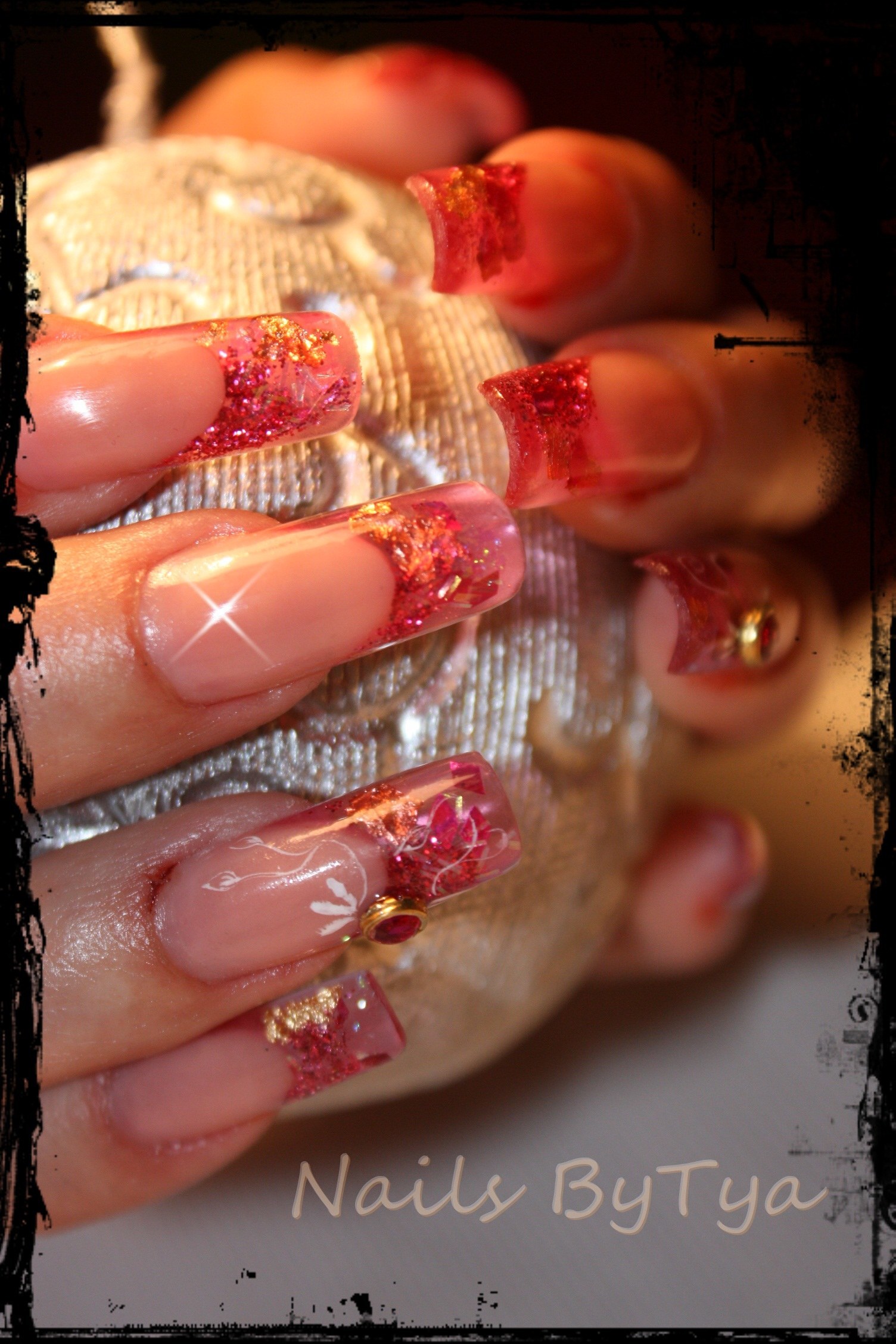 un vitrail rose, avec quelques feuilles d' or et babioles en incrustations